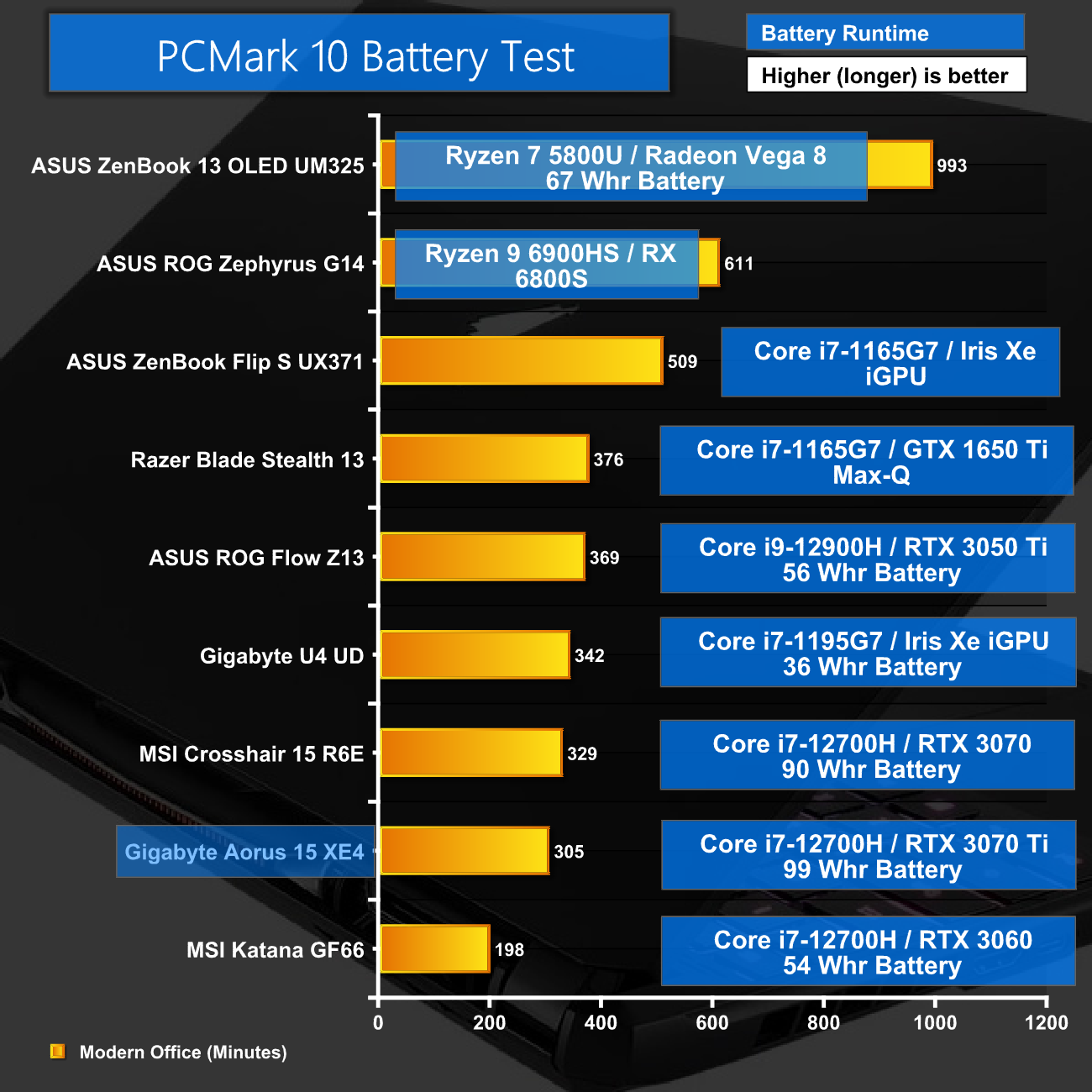 Battery life is OK for the Aorus 15. Despite the bigger battery than the MSI Crosshair 15 R6E, the CPU and GPU both draw more power so battery life is reduced by about 25 minutes. A run time of over 5 hours is still acceptable for light office tasks, but those who really need all-day battery would be better served by an ultrabook-style machine with a low-power CPU.