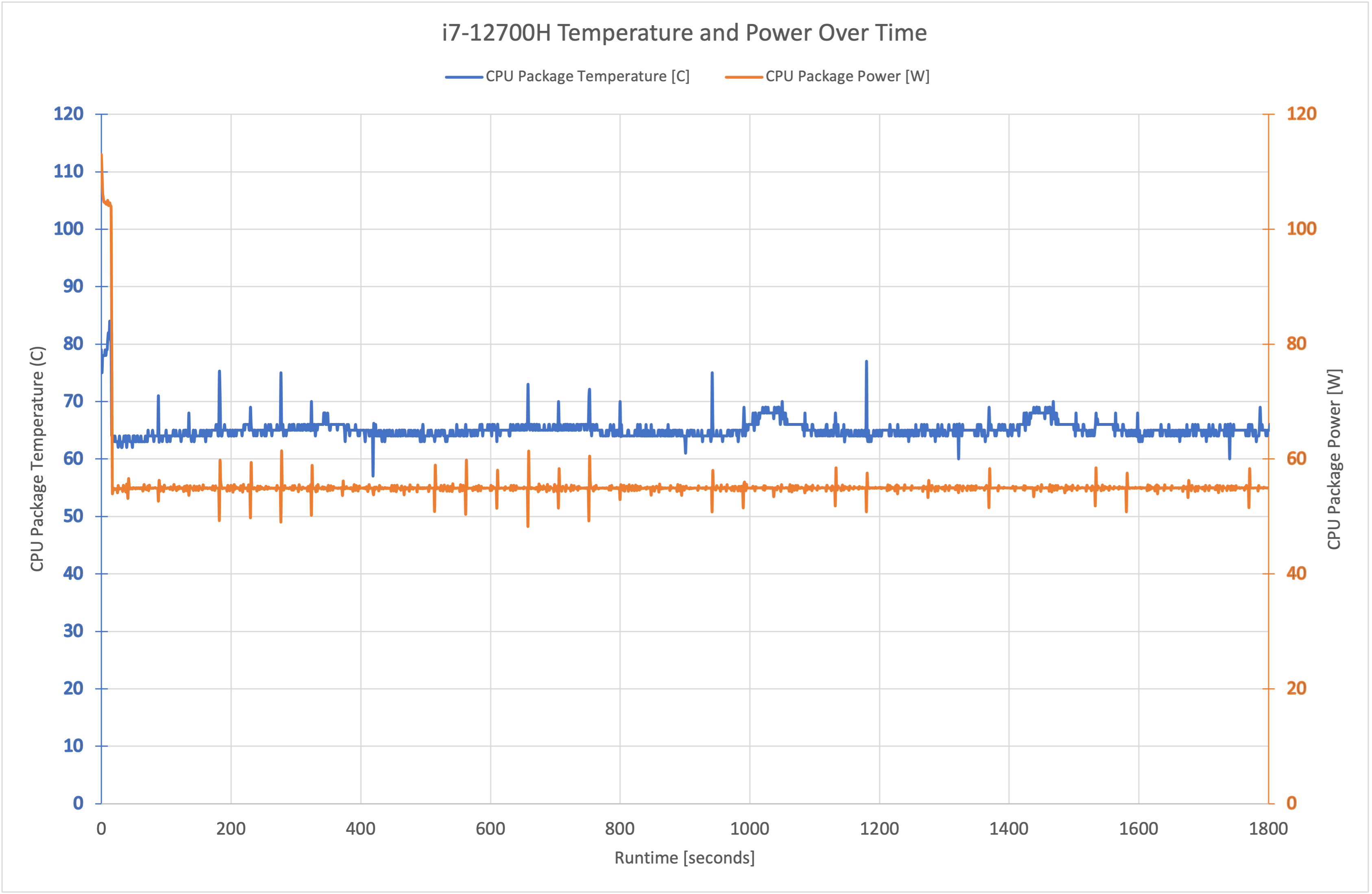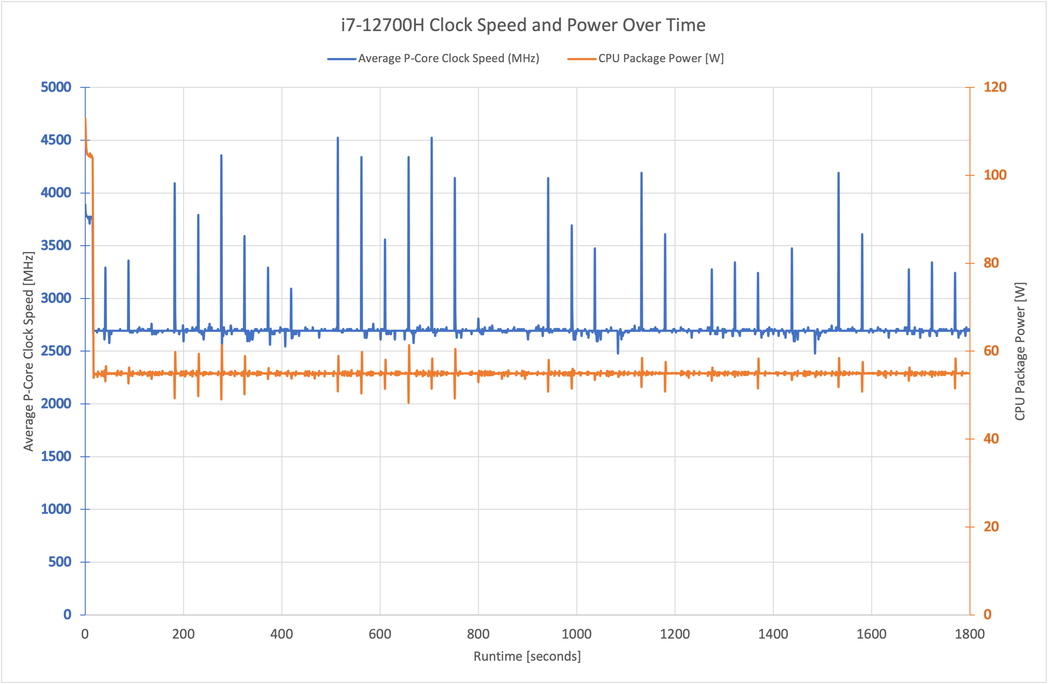 Starting with a look at default CPU behaviour, the i7-12700H draws 105W of power for a period just shy of 20 seconds, before quickly ramping down to 55W package power which it maintained for the rest of our 30-minute Cinebench R23 stress test. Clock speed for the P-cores similarly starts at 3.8GHz, before dropping down to hover at around 2.7GHz, occasionally flitting between 2.5-2.7GHz.