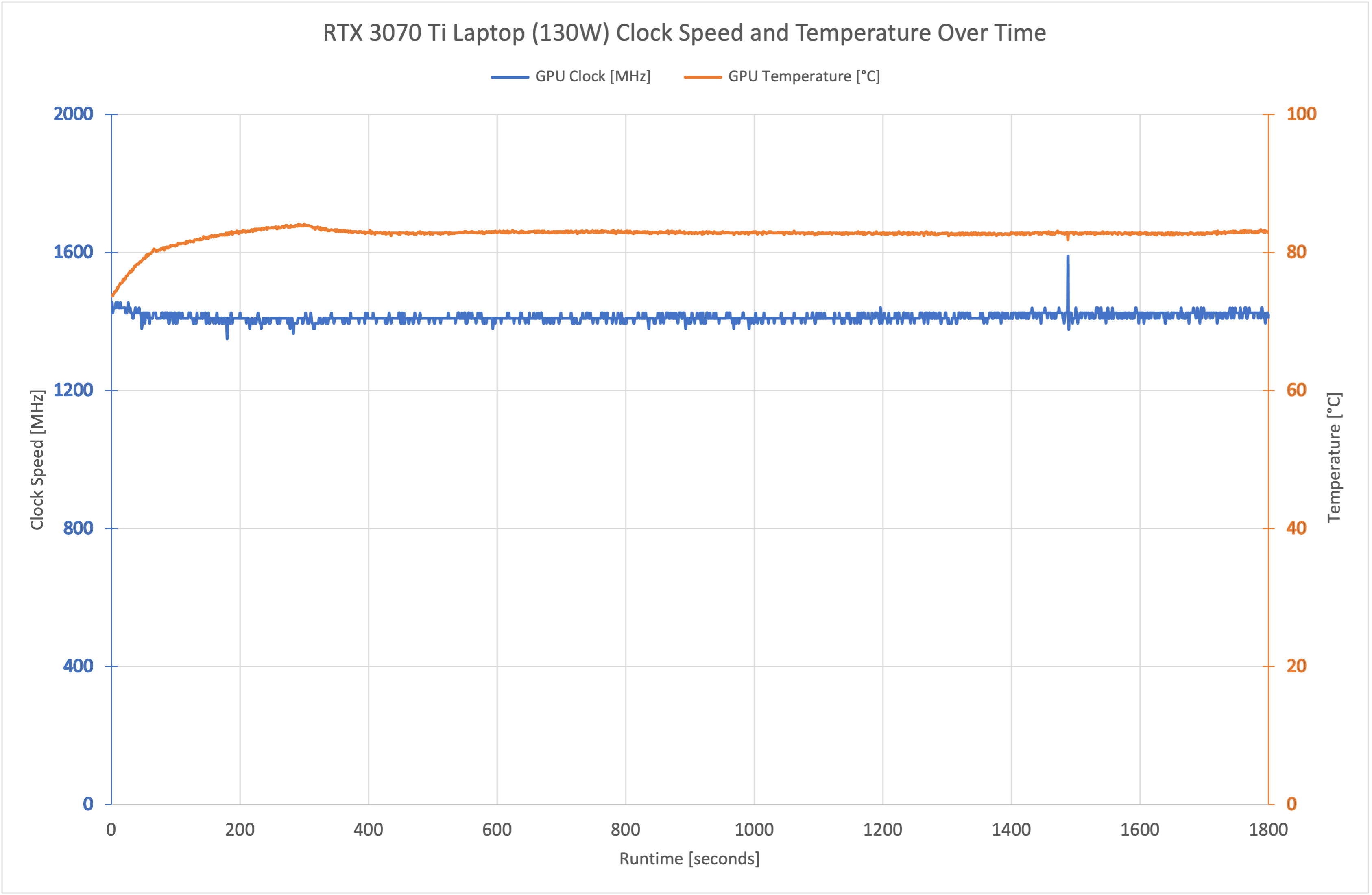 As for the GPU, the RTX 3070 Ti drew a consistent 130W across a 30-minute stress test in Cyberpunk 2077, with the core clock operating at an almost-fixed 1410MHz. GPU temperatures were well within safe limits, too, hitting 83C but no higher.