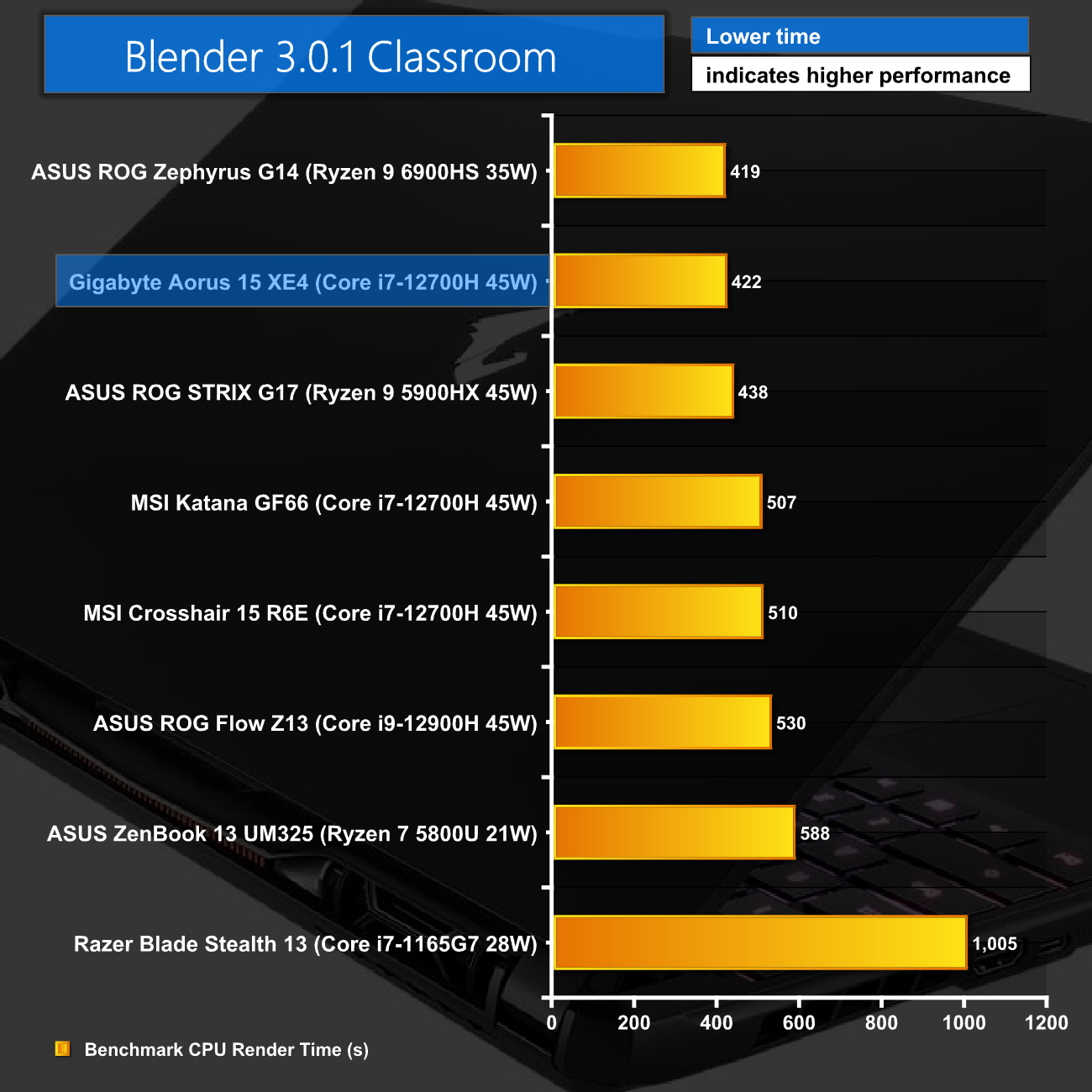 Likewise, Blender Classroom shows a good improvement in render times for the Aorus 15 compared to the other 12700H machines we have tested, once again due to the increased all-core speeds that the Gigabyte laptop is able to maintain.