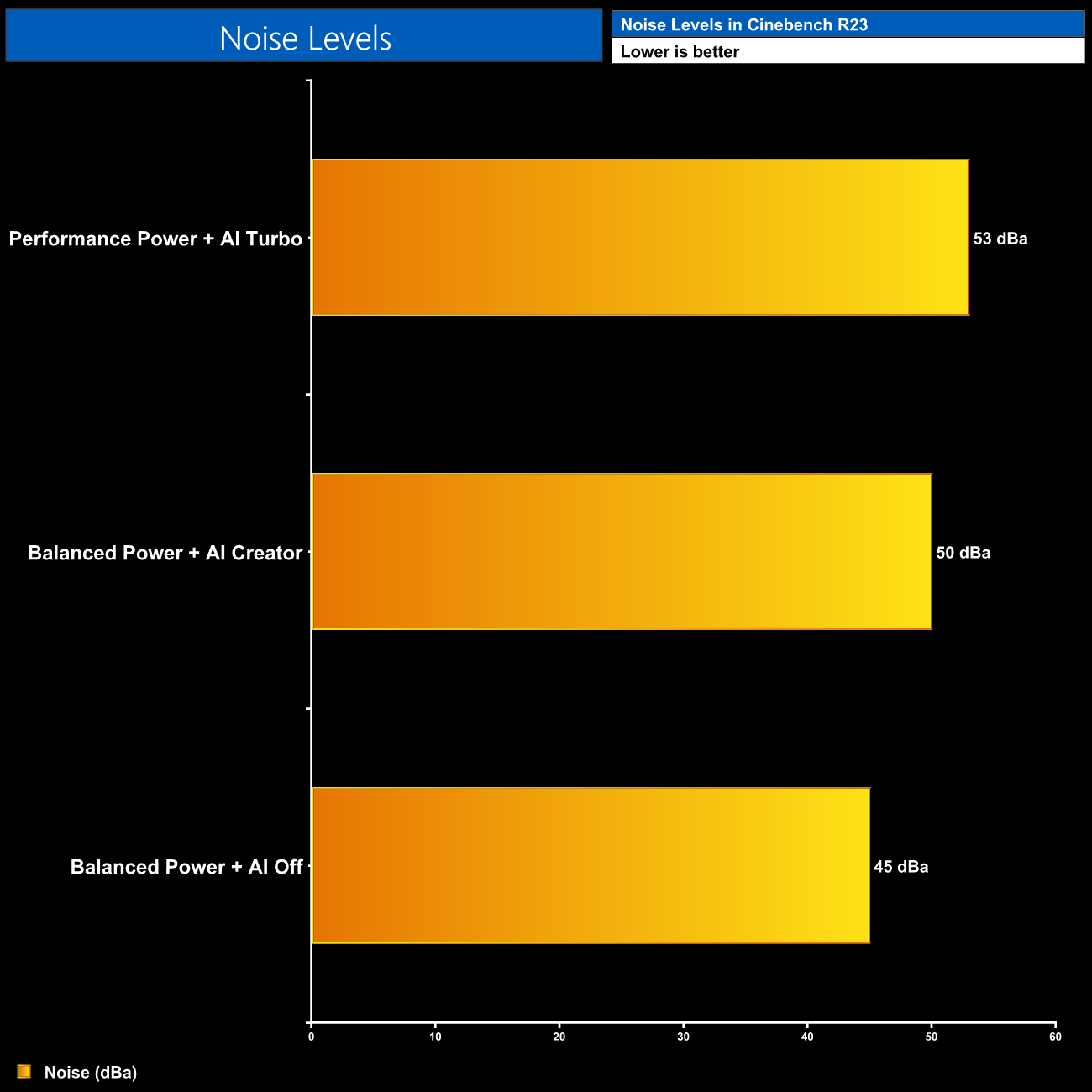 Part of the thermal performance is undoubtedly down to the fan speed however, which can get a bit raucous. As the power draw increases, so too does fan speed, and we measured a 50dBa reading (at a 30cm distance) using the AI Creator profile in Cinebench R23. The Turbo mode puts fan speed up to maximum and increase noise further to 53dBa, which is rather unpleasant – be sure to check out the video review on the first page for a sound test.