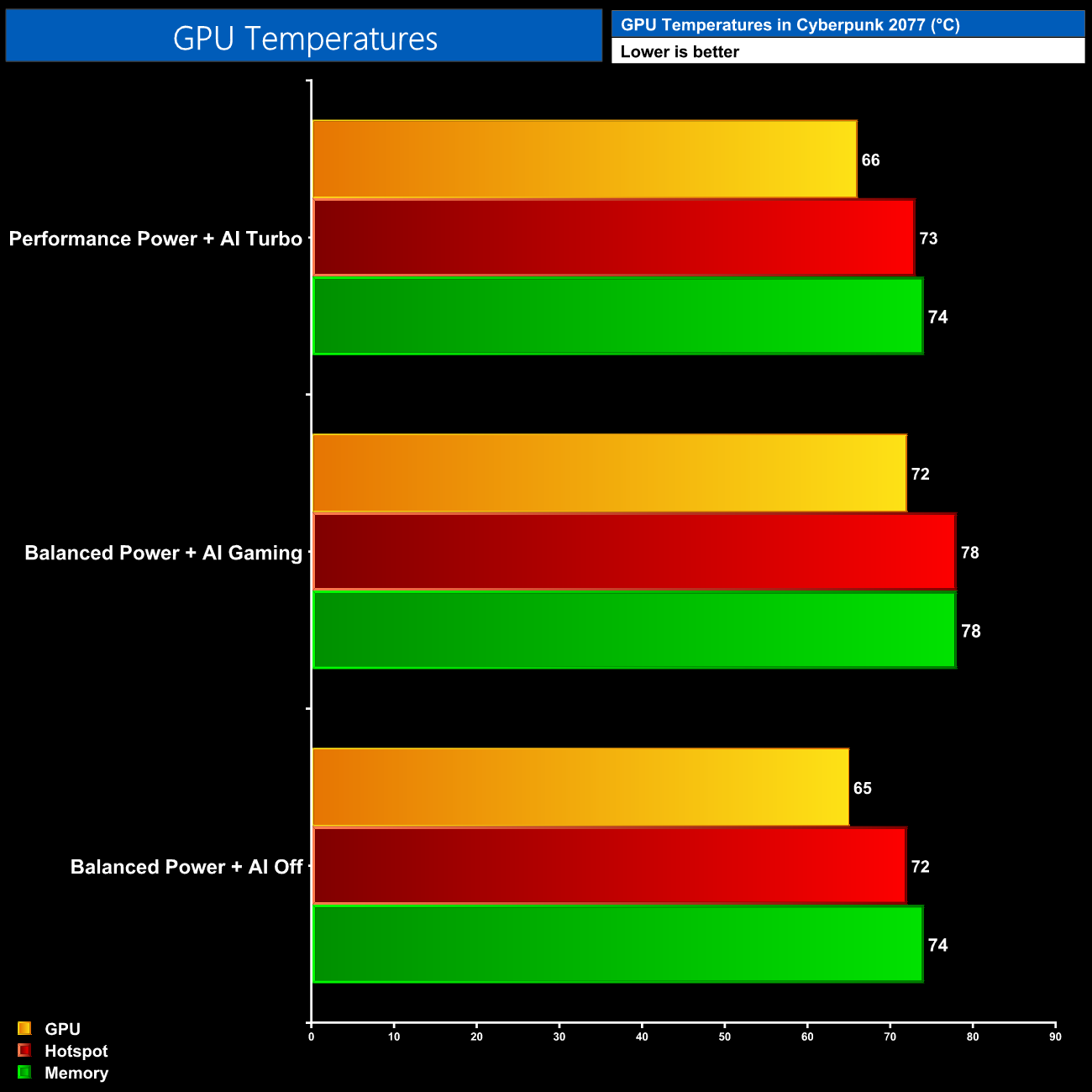 Likewise, GPU thermals are fine regardless of the profile used – the results with AI Off were the coolest due to the 95W power limit, but even at 115W we saw sub-80C temperatures on both the hot spot and memory.