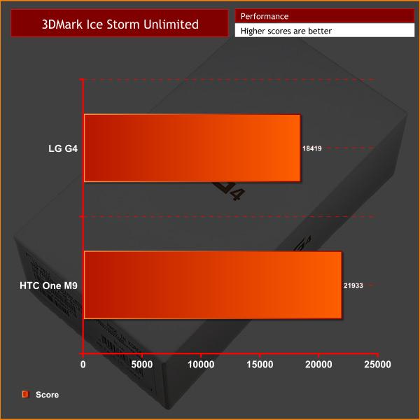 3DMark Ice Storm Unlimited is our other test, which focuses more on graphical power. The G4 scored 18419, a few thousand behind the 21933 scored by the M9. A slightly larger 19% difference here, but the two SoCs are clearly not poles apart.