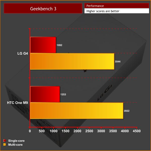 On to the benchmarks, then. As usual we start with Geekbench 3, and compare the LG G4 with the HTC One M9. For single-core performance, the G4 scored 1092, with a multi-core performance of 3544 – both impressive scores. The M9 scored 1253 and 3922, respectively – which indicates the 808 processor is not far behind the 810, with just a 10% speed difference between the two multi-core scores.