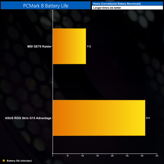 Lastly, despite packing a huge 99.9WHr battery, considering the level of hardware inside the GE76 Raider, it's not a surprise that battery life isn't great. It managed just under 2 hours in our PCMark test, so you can double that for almost 4 hours in the real world, though of course that doesn’t include any strenuous gaming. It’s OK if you need to send a few emails, but for any serious work or gaming, you will need to be plugged into the mains.