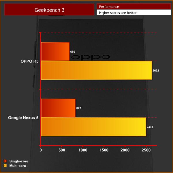 The excellent real-world performance carried over to the benchmarks. In Geekbench 3, the R5 scored 680 for its single-core performance, and 2632 for its multi-core score. This makes it the most powerful device we have tested to date, and in the same league as the similarly priced Nexus 5 – which scored 823 and 2491, respectively.