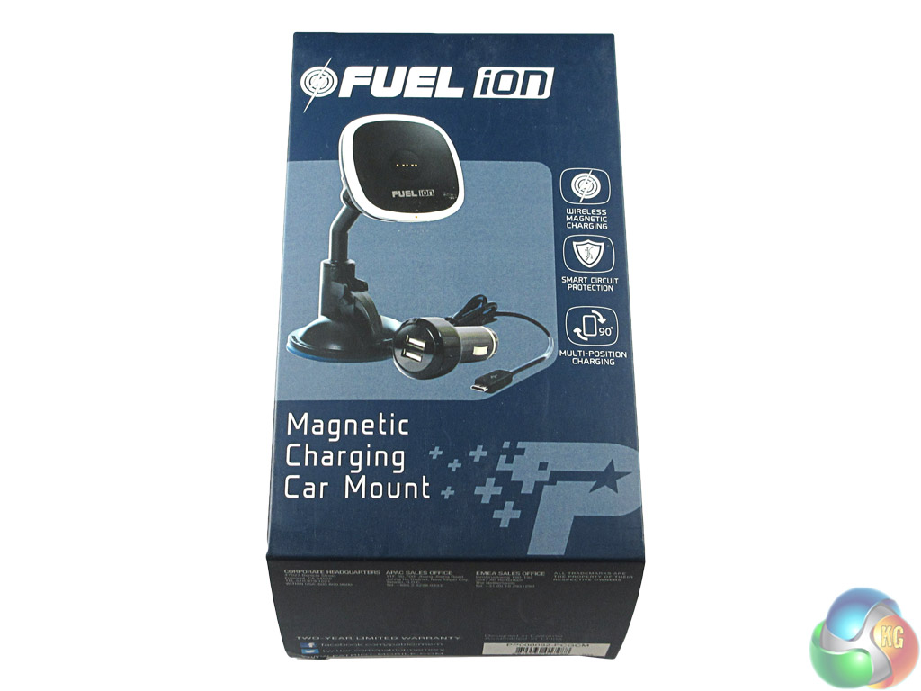 Instead of clear plastic, the packaging for the car mount is dark blue cardboard. A picture of the mount is visible on the front, as well as FUEL ion branding. Inside, there is a quick-start guide, the mount itself and a USB charger which connects to your car's cigarette lighting socket.