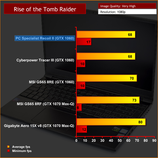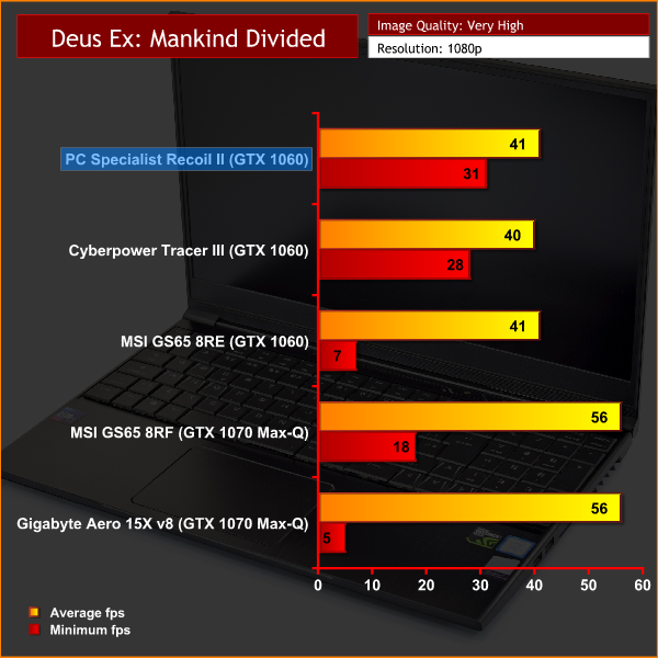 When testing the Recoil II, we compared it directly to both configurations of the MSI GS65 we have tested, as well the Gigabyte Aero 15X and Cyberpower Tracer III. All four laptops use the i7-8750H processor, while the graphics varies between full-fat GTX 1060s, and GTX 1070 Max-Q models.