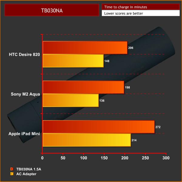 We charged each device using the TB030NA's 1.5A port, as well as a second test using a mains AC adapter to allow a comparison between mains charging and the TB030NA.