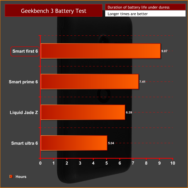 A benchmark time of 9:07 confirms this, with the first 6 becoming the longest-lasting phone yet in the Geekbench 3 battery benchmark.