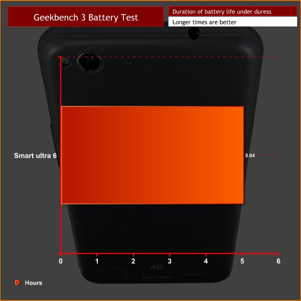 We are also adding in a new battery benchmark to our phone reviews. This is the battery test included within Geekbench 3, which loops its hardware benchmark until the device fails. The Smart ultra 6 lasted 5:04:40, which means it has a battery score of 2031.