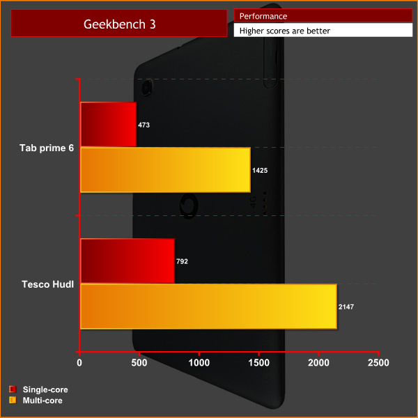 Budget performance is reflected in the benchmark results. As you can see above, the Tesco Hudl 2 comprehensively out-performs the Tab prime 6 in Geekbench 3 – despite costing £51 less.
