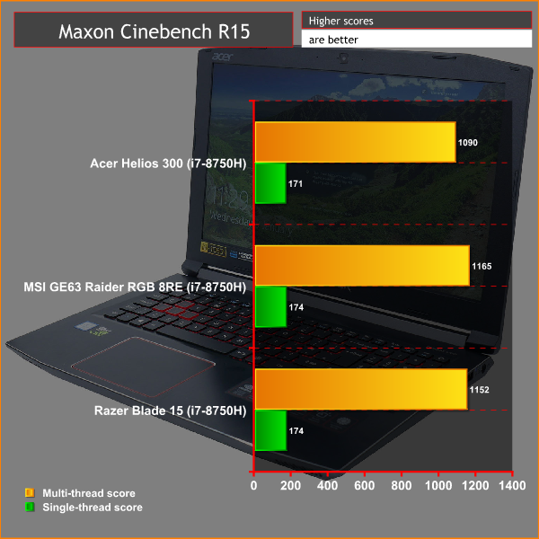 Against modern competitors that use the same Intel processor the Helios 300 comes up ever so slightly short in both multi-threaded performance and single-threaded performance, suggesting it maybe uses a slightly less capable cooling solution, but the margin is small enough to be of very little consequence in day to day use.