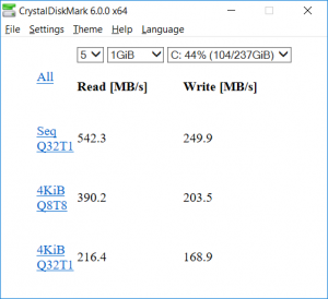 The Toshiba SSD used here is frankly a bit disappointing. Despite using a modern M.2 form factor it doesn’t use the modern NVMe connection standard so is limited to around 550MB/s read and write speed. However, it even struggles to hit these theoretical figures with it managing 542MB/s read speed and just 250MB/s write speed. By modern standards that’s downright poor.