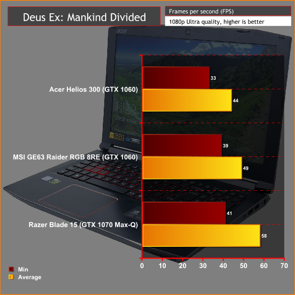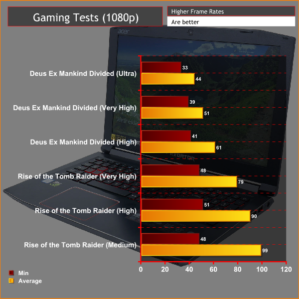 We can see here that the laptop delivers largely playable framerates across the board, with the very demanding graphics of Deus Ex: Mankind Divided just starting to push the laptop to its limits.