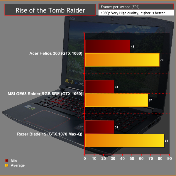 In Rise of the Tomb Raider we see a slightly odd performance trend as the Helios 300 consistently outperforms the MSI GE63 by a significant margin and come close to the performance of the Razer Blade 15. The only thing we can put this down to is that since we tested those other laptops there has been some performance-optimising either on the part of the game developer, Nvidia's drivers or both.