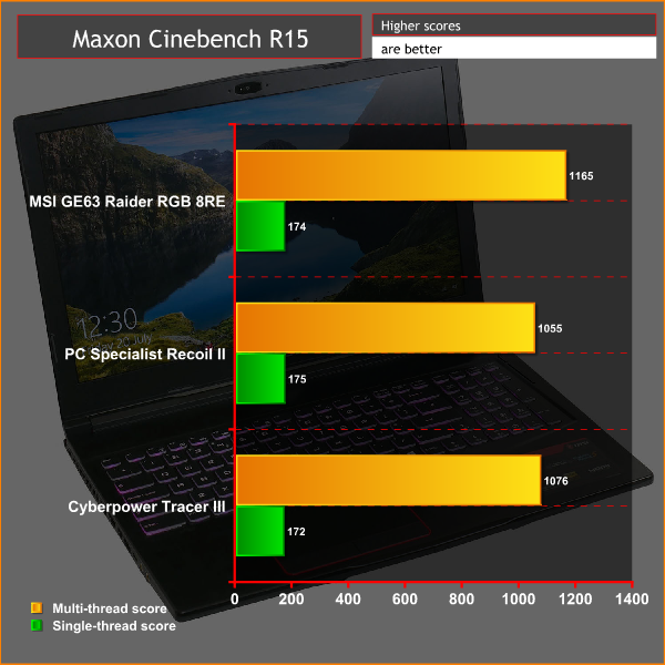 The MSI GE63 Raider RGB 8RE holds its own against its direct competitors, taking top marks for its multi-thread score and coming in second place for the single-thread test. Moreover, all three laptops offer ample performance both for day to day stuff and gaming.