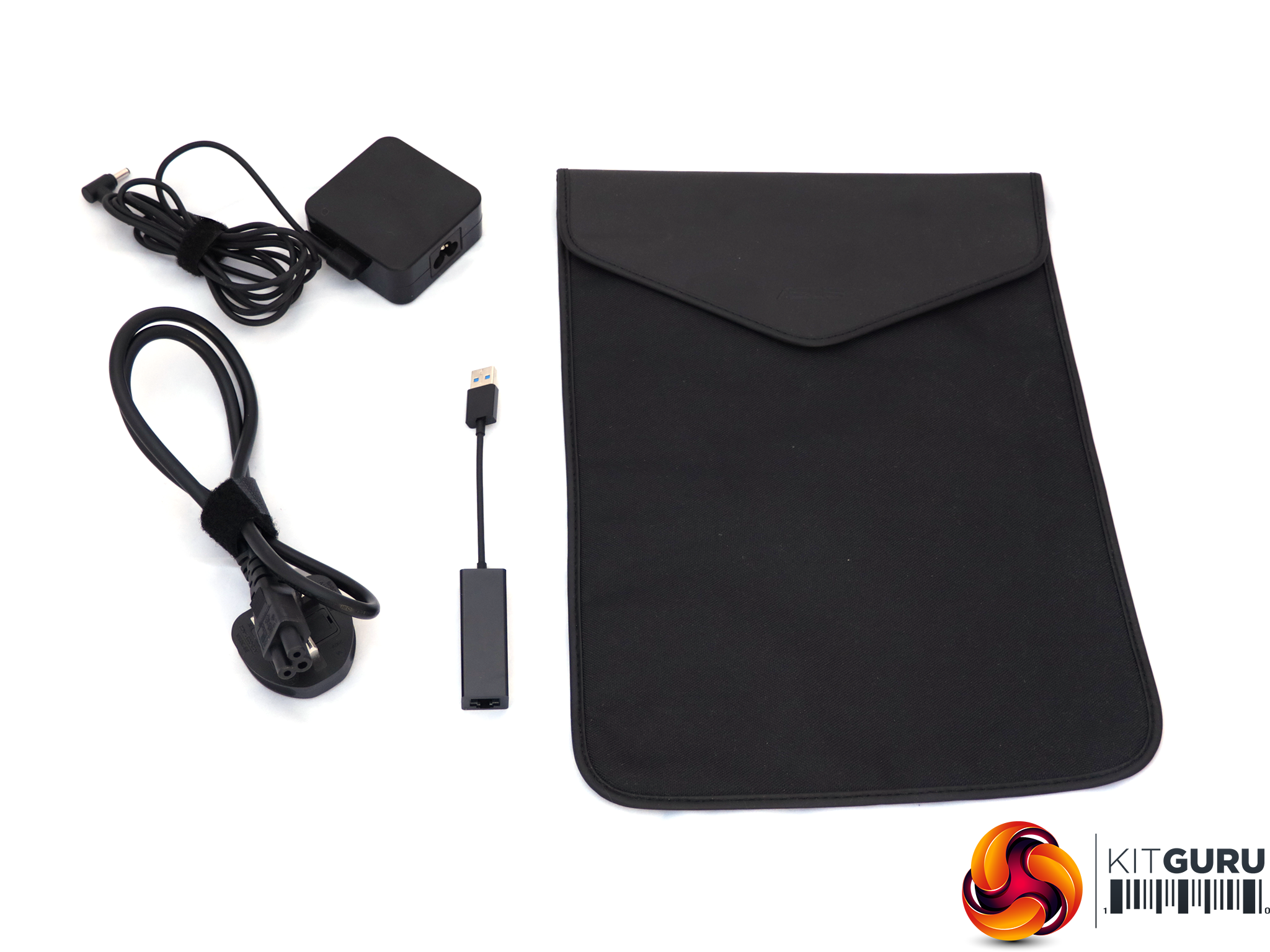 The ASUS ZenBook 13 UX331UN arrives in a reasonably well-presented box. You don't get a huge range of extras inside, apart from the external power supply. There's a woven protective pouch and USB 3.0 Ethernet adapter, because the notebook doesn't have an Ethernet port built in due to its svelte chassis.