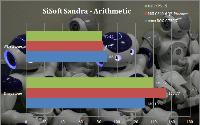 Processor arithmetic is a little behind too, with superior Dhrystone than the Asus ROG G750JZ, but inferior to the MSI, and the lowest Whetstone of the three, albeit not by much.