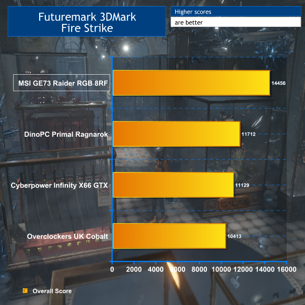 Our first hint that the mobile NVIDIA GeForce GTX 1070 graphics are something special comes from the Fire Strike 1.1 score in Futuremark 3DMark. A desktop GTX 1070 will deliver somewhere between 12,000 and 15,000 in the basic Fire Strike, depending on the underlying system, so this notebook is right in the mix, and ahead of all our desktops.