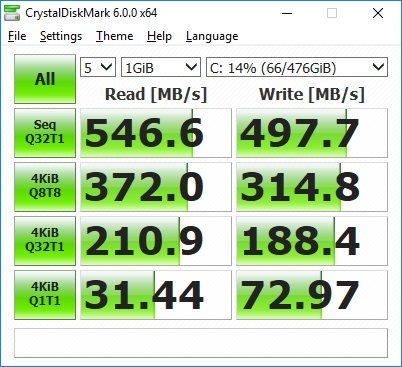 The Samsung PM871a SSD shows the drawback of its SATA interface. It's a little disingenuous to call 547MB/sec reading and 498MB/sec writing slow, but we're seeing NVMe drives deliver six times this performance now. This is still much faster than a conventional hard disk (see below), and the operating system and software loads quickly enough on this notebook. But we're still waiting to see NVMe SSDs arrive on notebooks in earnest, which will make hibernation mode really fly when you turn the system back on.