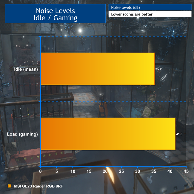 The GE73 is pretty quiet, even under load. The fan does audibly fire up once an intensive game has been running for a few minutes, but only to a certain level, and if you're wearing headphones, you won't notice this at all. Even those who are sitting nearby and aren't wearing headphones shouldn't be particularly perturbed.