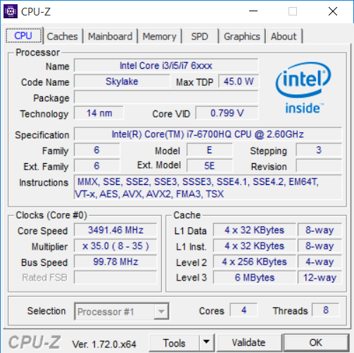 The GS40 sports a Core i7-6700HQ processor from Intel's latest Skylake generation. This quad-core CPU runs at a nominal 2.6GHz, but with a 3.5GHz Turbo mode for a single core, 3.3GHz for two cores, and 3.1GHz for all four. This is the second slowest mobile quad-core from Intel's Skylake range (the i5-6300HQ is slower), but should still pack a significant punch, and only draws 45W at full pelt.