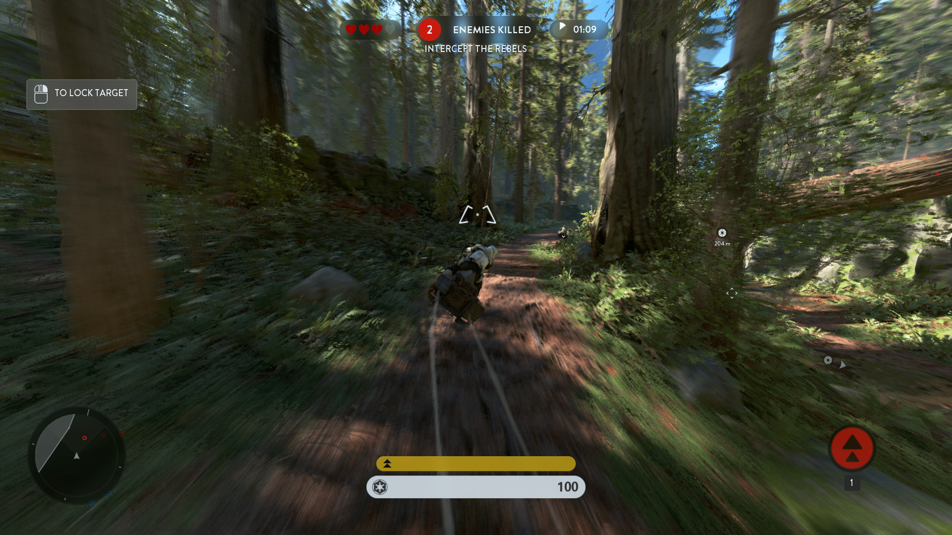 We have all wanted to ride a Speeder Bike through the jungles of Endor, and this training level gives you the opportunity to test your skills. The trees fly by as you chase your enemy, posing double challenges of not crashing, whilst catching and killing your foe. Of the three tests levels we used, it's the most graphically demanding, with rapidly changing background scenery.
