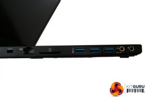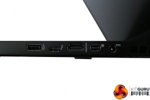 On the right-hand side there is a single USB 2.0 Type-A port, with a USB 3.1 Type C port next door, then full-sized HDMI and Mini DisplayPort, and finally the power connector. The left-hand side is home to the Kensington lock slot, Gigabit Ethernet, SDXC card slot, three USB 3.0 Type A ports, and separate minijacks for headphones and microphone. The headphone output also doubles as digital S/PDIF. Wireless connectivity includes 802.11ac WiFi and Bluetooth 4.2.