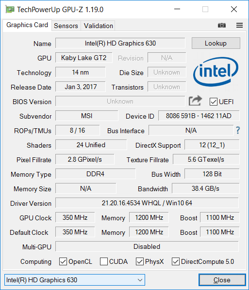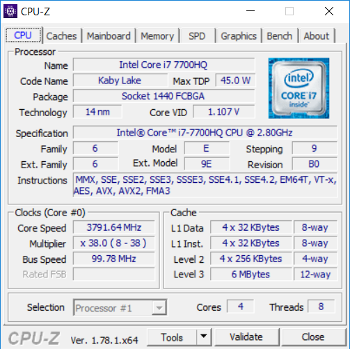 The Intel Core i7-7700HQ may be the least well endowed mobile Kaby Lake quad-core, but whilst it has a nominal clock speed of 2.8GHz, the top single-core Turbo mode is 3.8GHz, with two cores able to run at 3.6GHz and all four at 3.4GHz.