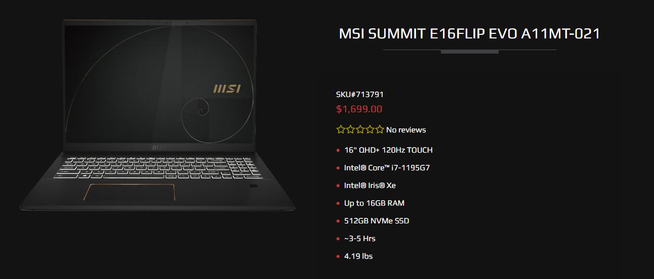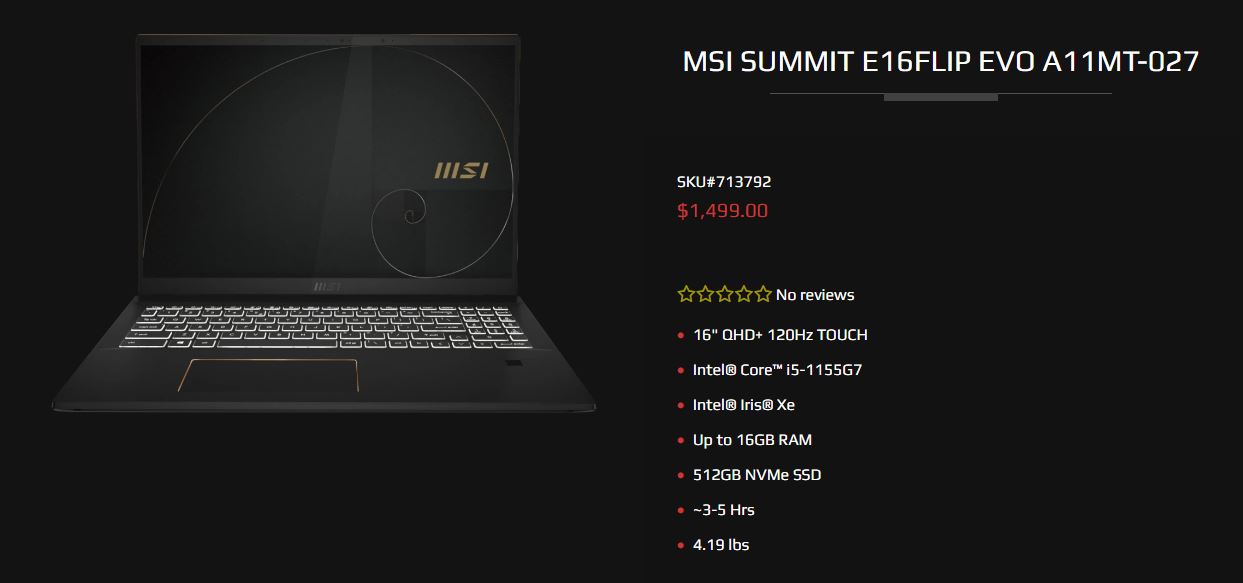 According to the links shared by @momomo_us, the retailer XoticPC is allowing customers to pre-order the MSI Summit E16 Flip Evo laptop powered by Tiger Lake-R processors: one with the i5-1155G7 and another with the i7-1195G7.
