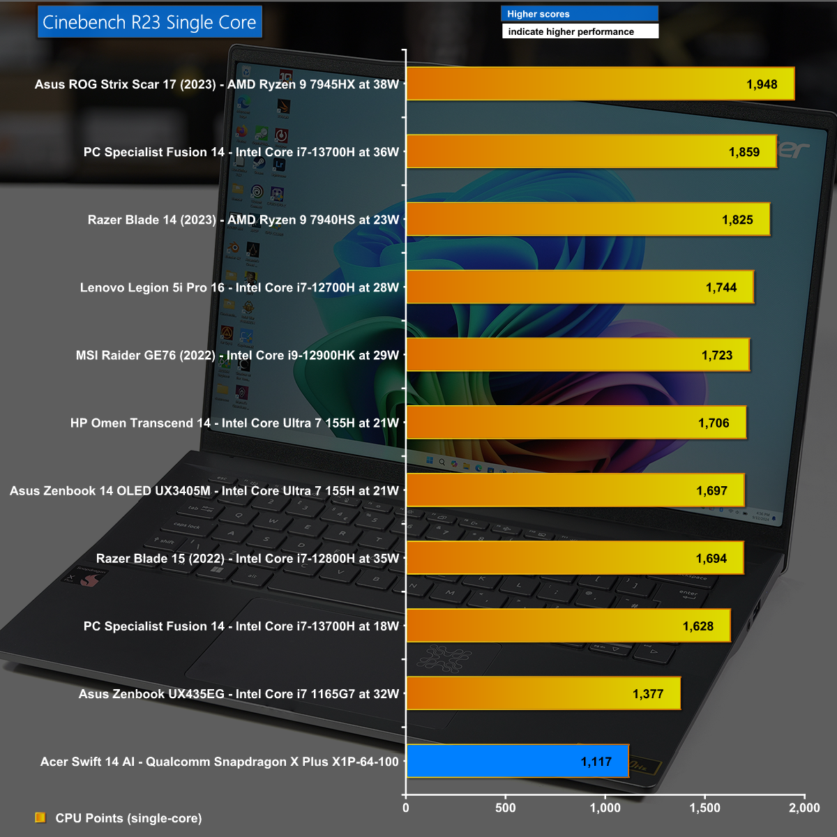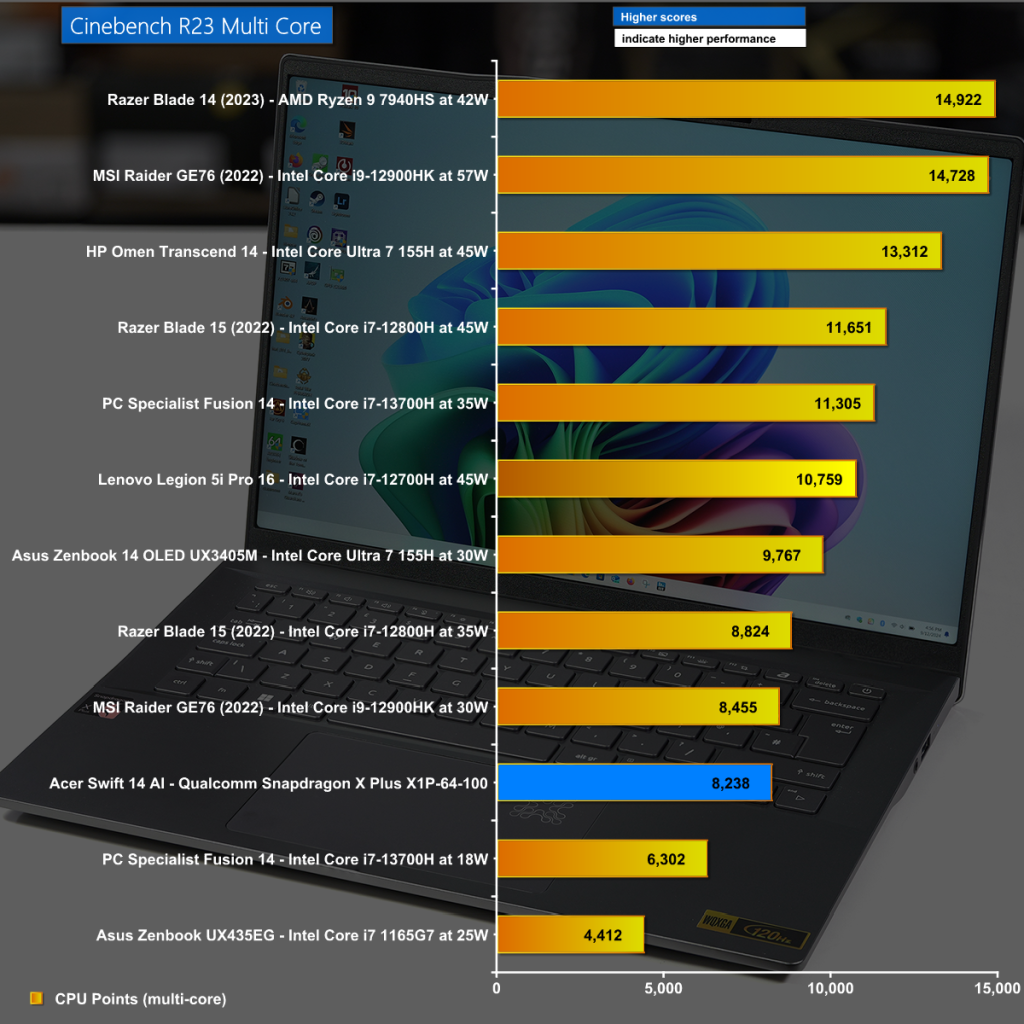 In Cinebench R23 Multi Core the Snapdragon X Plus chugged along at a reasonable speed and the ten cores delivered the same performance as an Intel Core i7 or i9 from a couple of years ago.