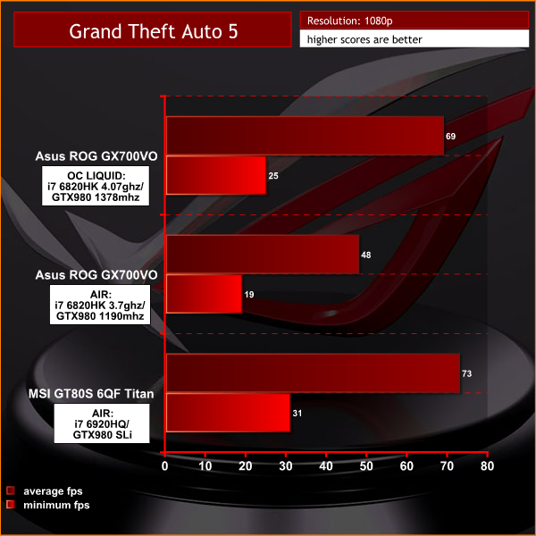We tested the Asus ROG GX700 with an array of games, PC Mark 8, 3D Mark and Cinebench R15. The first set of test runs were performed with the laptop running on air cooling and there were absolutely no surprises. The combination of Core i7 and Desktop GTX 980 is a proven winner and powers along superbly well. We had the game settings cranked to maximum quality and the average frame rate figures reflect that fact. Grand Theft Auto V in particular was borderline with an average of 48fps however it was entirely playable and looked superb.