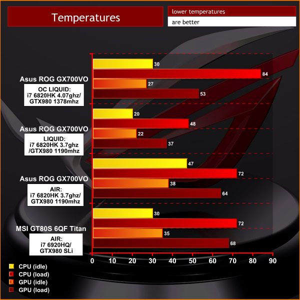 In air cooled mode the ROG GX700 performs as you would expect. Using AIDA 64 to stress the hardware we saw a CPU temp of 72 degrees and a GPU temp of 64 degrees.