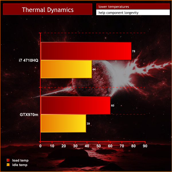 - Superb gaming performance from the Core i7 and GTX 970M.