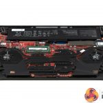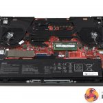 With the bottom cover removed we can see the ASUS TUF Dash F15 is laid out in a conventional manner with an extensive cooling system on the CPU and GPU that takes up half the space inside. Then we have the M.2 SSD storage and DDR4 memory in the middle with the 76Wh battery pulled to the front.
