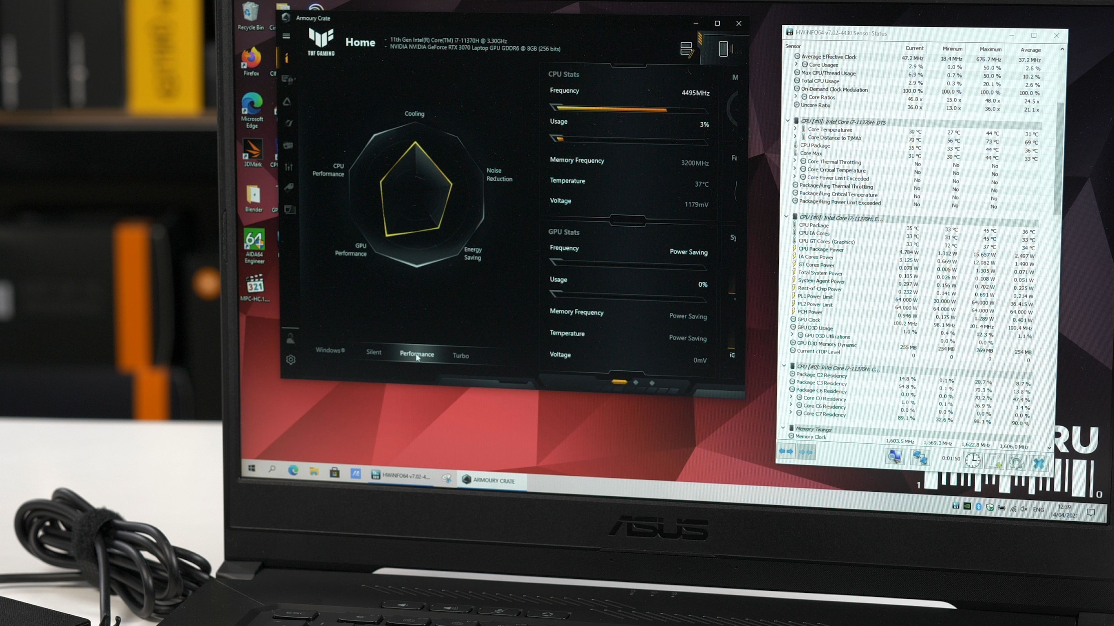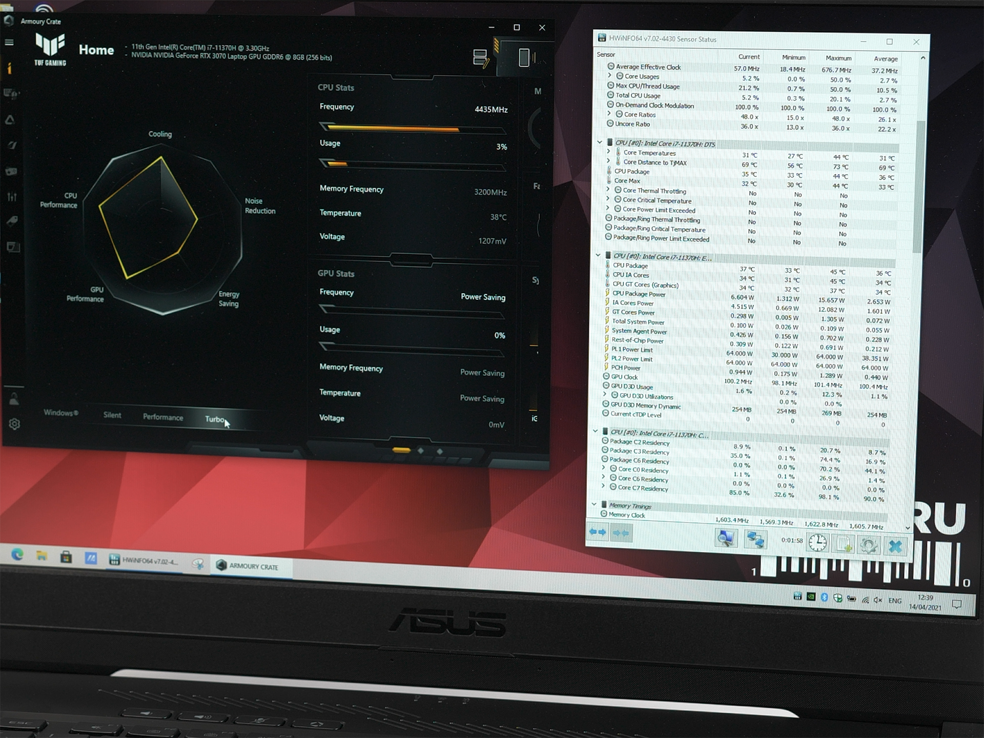 In our video we demonstrate that while CPU this has a nominal TDP of 35W, the behaviour of the ASUS TUF Dash F15 is controlled by ASUS Armory Crate which adjusts the PL1 Power Limit from 30W in Silent Mode to 64W in Performance Mode. In Turbo Mode the 64W figure is maintained and fan speed is ramped up to boost the cooling.