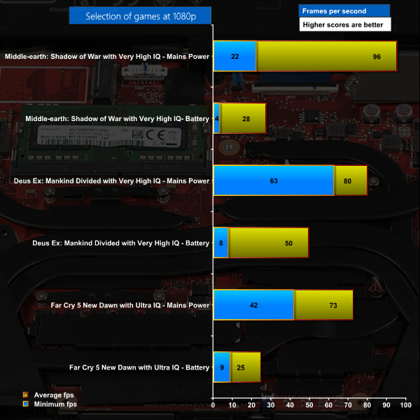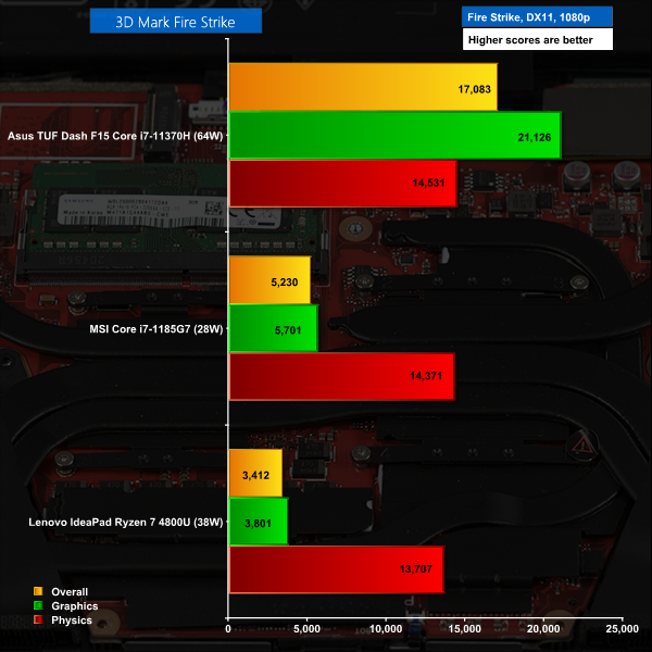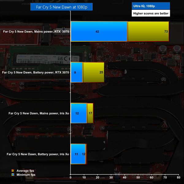 When it comes to gaming the ASUS TUF Dash F15 delivers the goods, thanks to the GeForce 3070 graphics chip with 8GB of dedicated memory. If you pull the power cord and run on battery the performance drops like a stone. Gaming is not possible on the integrated Intel Iris Xe graphics as they cannot sustain acceptable frame rates at 1080p with decent image quality.