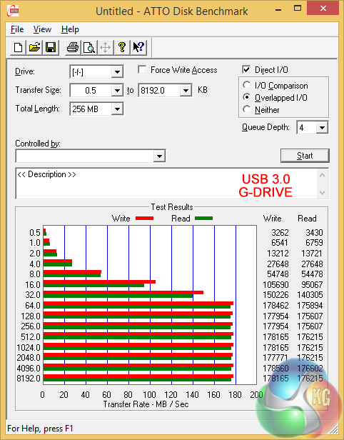 I switched to a 4TB G-Drive (Hitachi desktop drive in a USB 3.0 caddy) and saw the performance increase to 170MB/sec. It is a crying shame I didn't have a USB 3.0 Solid State Drive to hand to see whether I could get above 300MB/sec but on the plus side the barebones installation of Windows 8.1 meant the testing software ran without a hitch.