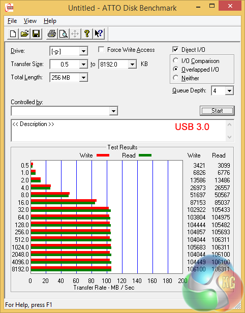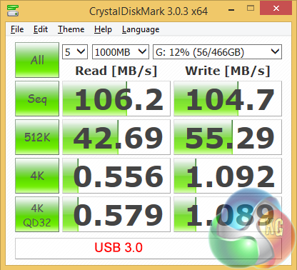 Testing the USB 3.0 sub-system didn't go entirely to plan. My Asus Express Box hard drive pushed performance over 100MB/sec however that is a drop in the ocean for USB 3.0.