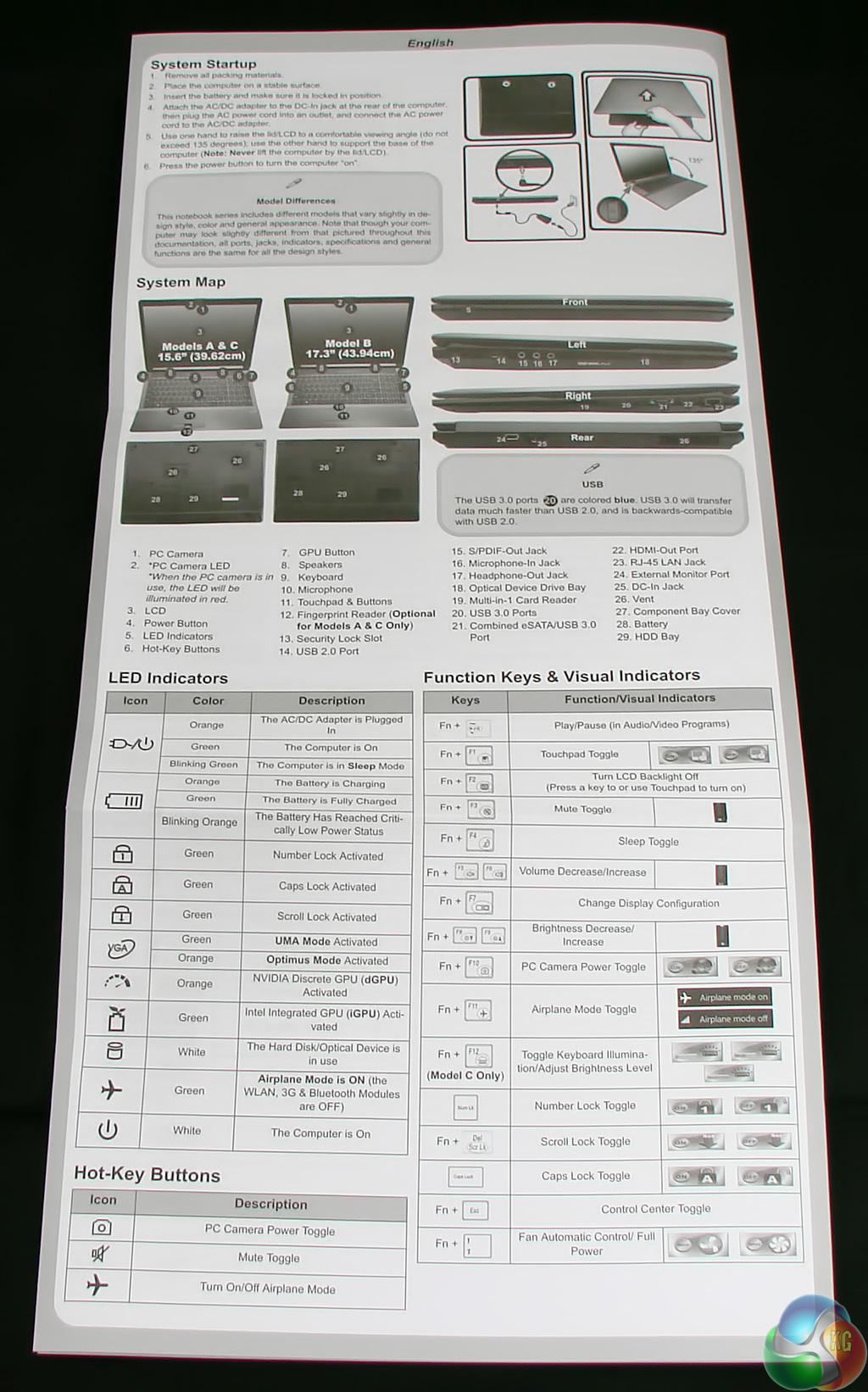 You don't get much in the way of accessories. The product guide covers three variants of this chassis (this 17.3-inch and two 15.6-inch versions). There are separate driver discs for Windows 8 and 8.1 and you get two plastic shims that you use to pack out the dual drive bays in the event you switch to a super slim hard drive.