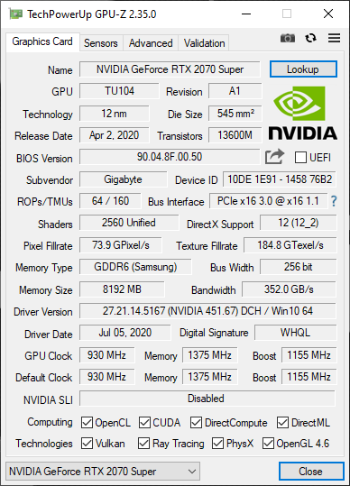 On the graphics side of things we have an Nvidia RTX 2070 Super chip with 8GB of GDDR6 memory. The Super version has a handy 11 percent boost in the number of CUDA cores compared to the original RTX 2070 and that gives a useful lift to performance. The CPU and GPU are backed up by 16GB of dual channel Crucial DDR4-3200MHz and a 512GB Samsung PM981a SSD.