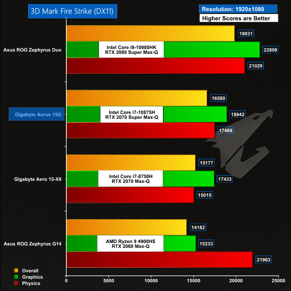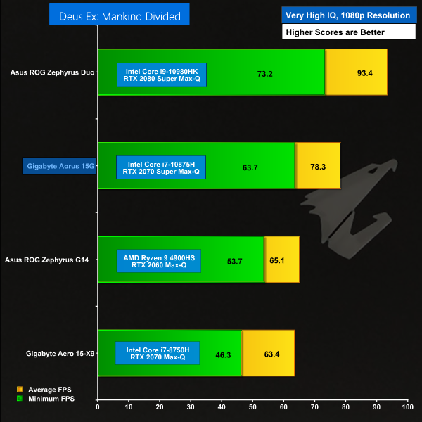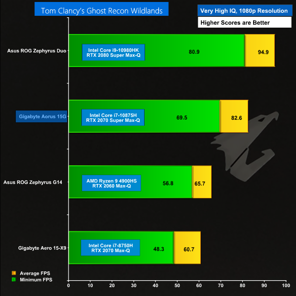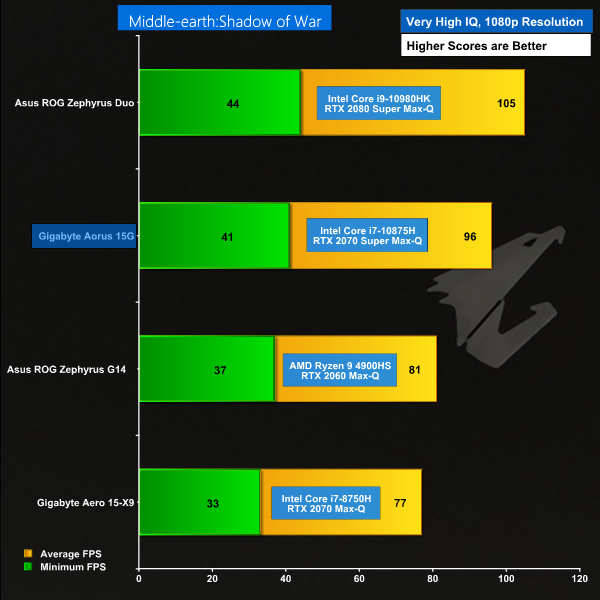 The Gigabyte Aorus 15G delivers excellent gaming performance, which is exactly what we expect from a combination of eight cores of Intel Core i7 plus an Nvidia RTX 2070 Super Max-Q graphics chip. The charts are topped by the Asus ROG Zephyrus Duo, which has a more substantial CPU and GPU, while the Asus ROG Zephyrus G14 with RTX 2060 Max-Q graphics is further down the charts. There is no doubt the Aorus 15G is a fine laptop for gaming at 1080p however the 240Hz panel is unlikely to be pushed to its limits when you are playing a AAA game.