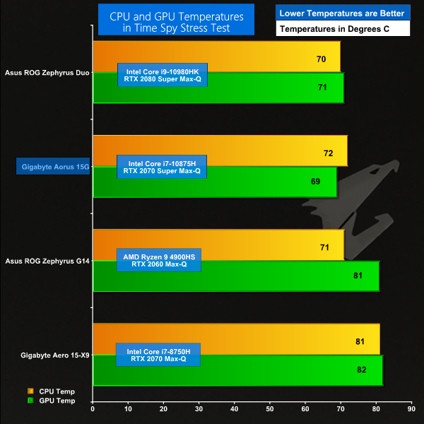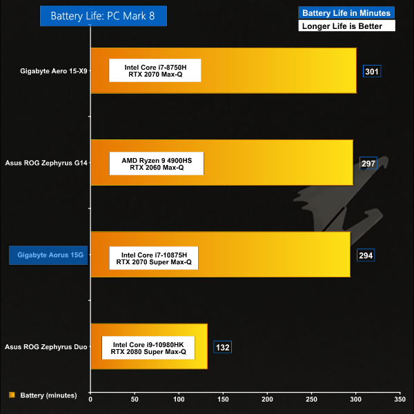 Gigabyte has employed a 94Wh battery, just as it did in the Aero 15-X9, yet it has managed to deliver the same battery life with a laptop that is noticeably more grunty. Five hours in PC Mark 8 equates to ten hours in the real world, and that is good enough for a full day of work.