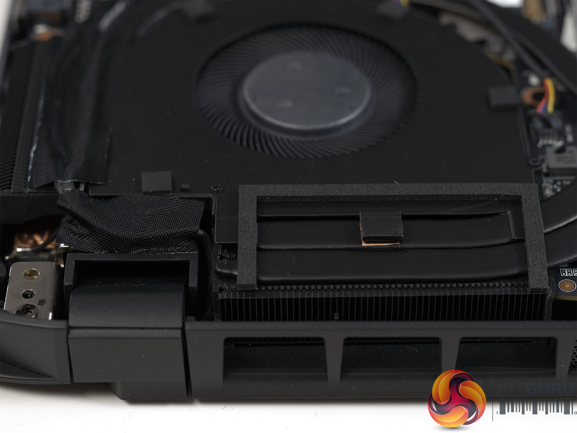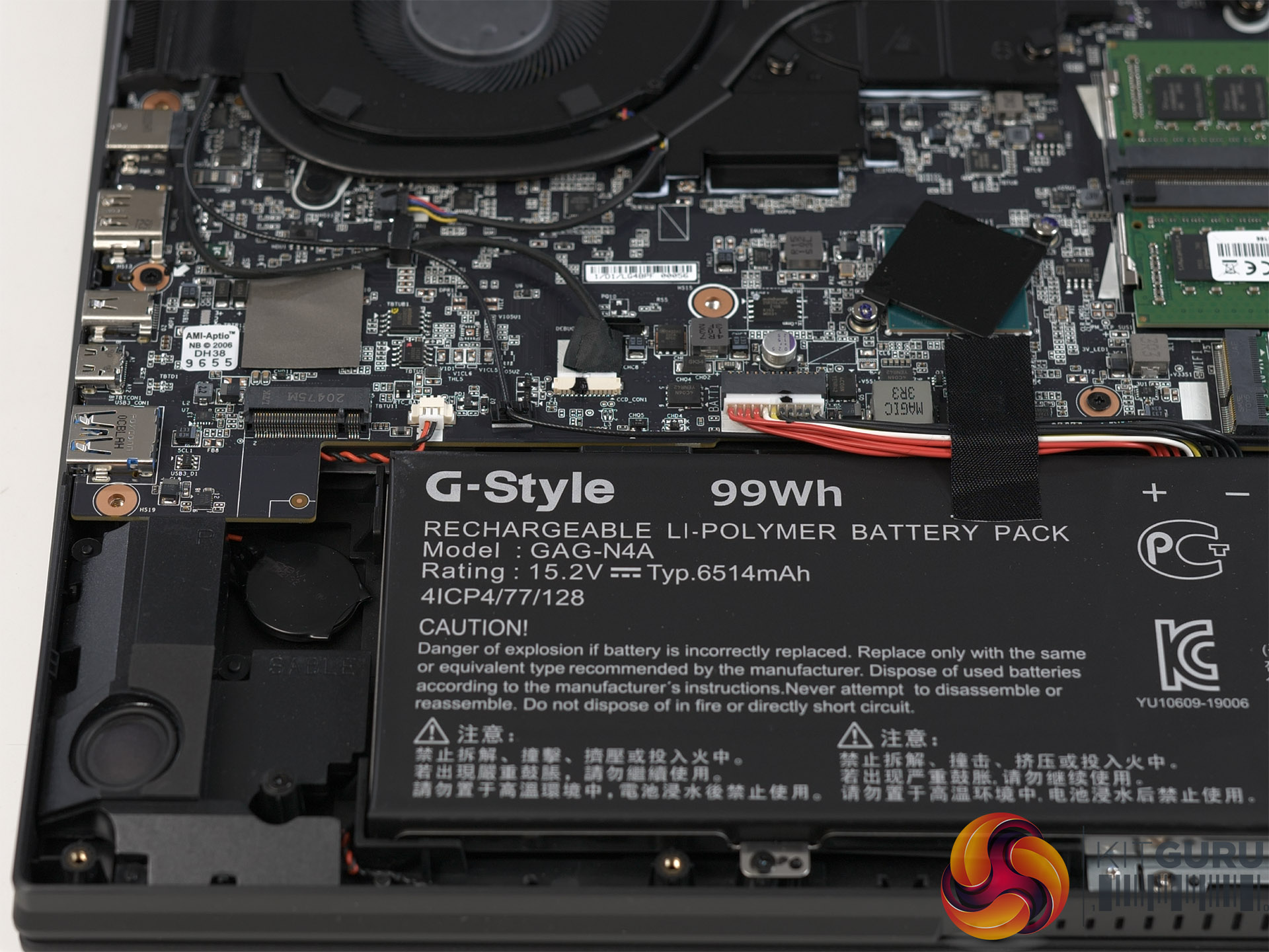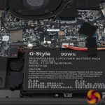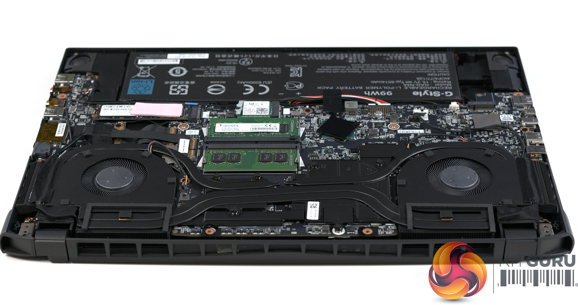 When you pop the bottom cover off the Aorus 17D and take a look inside you will find the layout looks entirely conventional. Most of the rear section is filled with the cooling system and the hefty 99Whr battery sits under the keyboard.