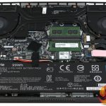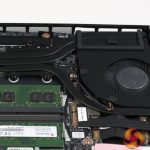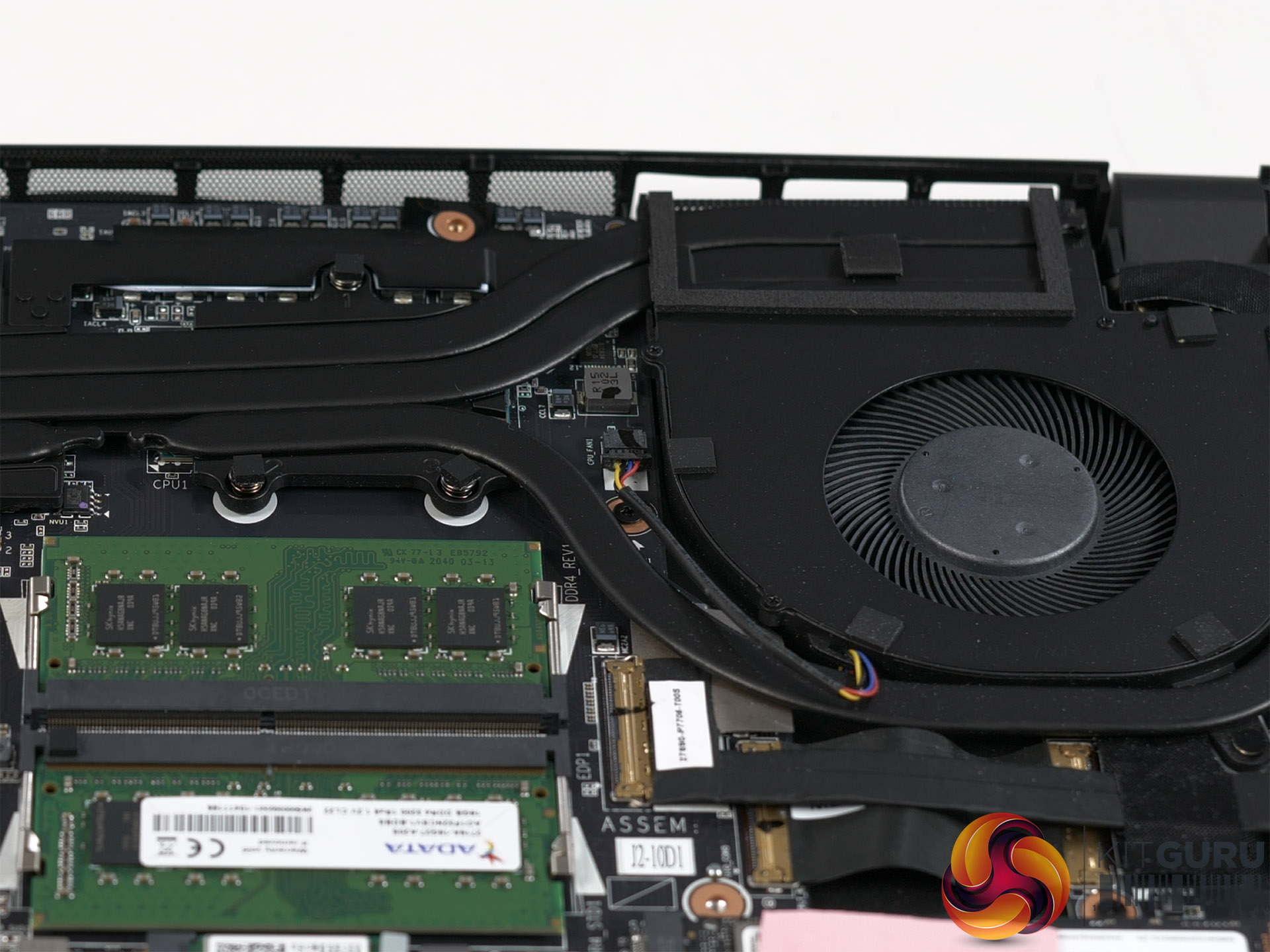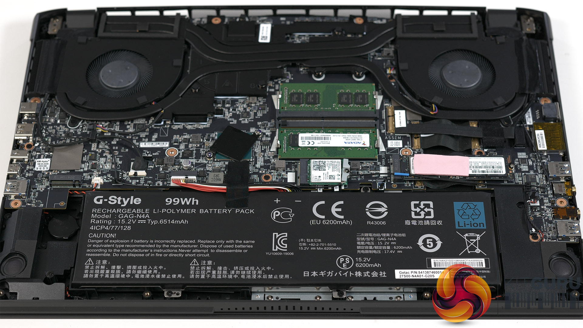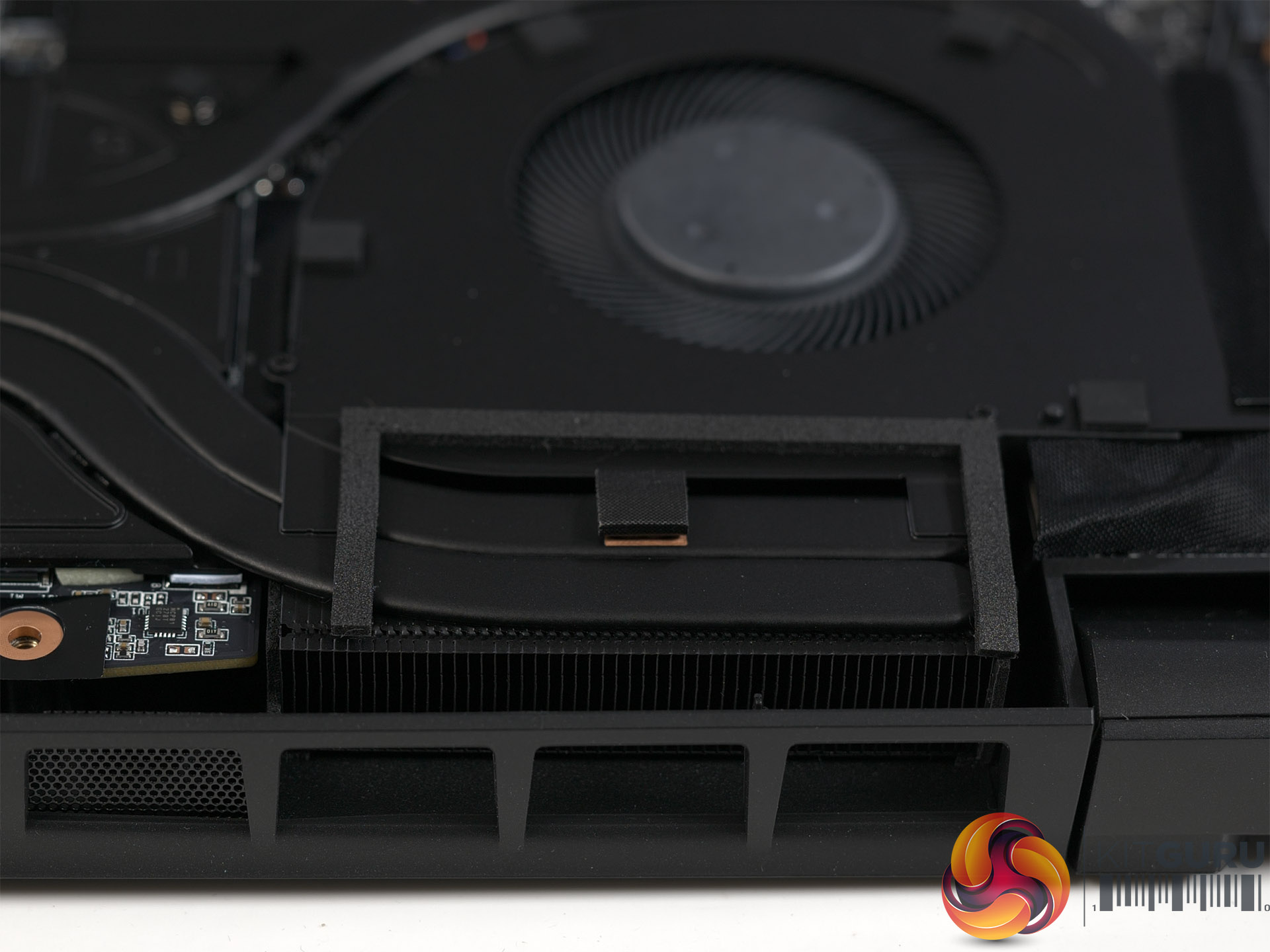 When you pop the bottom cover off the Aorus 17D and take a look inside you will find the layout looks entirely conventional. Most of the rear section is filled with the cooling system and the hefty 99Whr battery sits under the keyboard.