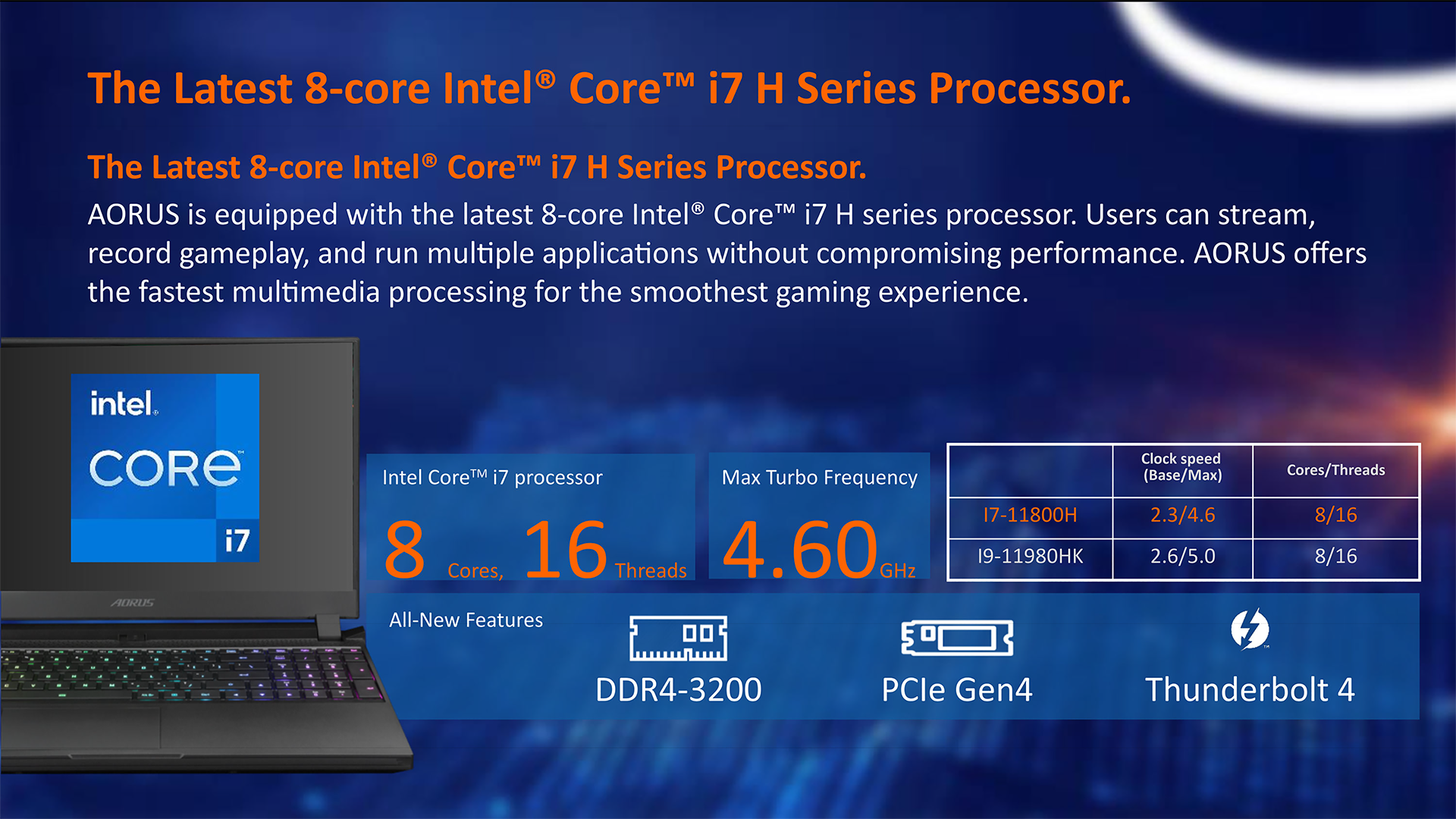The CPU is a brand new Intel Core i7-11800H Tiger Lake that has a maximum Turbo Frequency of 4.6GHz. During our testing we saw the CPU running at 4.0-4.2GHz on all cores and 4.59GHz on a single core. We all know that a laptop is more than the sum of its parts and Gigabyte has added a number of significant features including a cooling system called WindForce Infinity, a Full HD display panel with 300Hz refresh and a mechanical keyboard that uses OMRON switches.