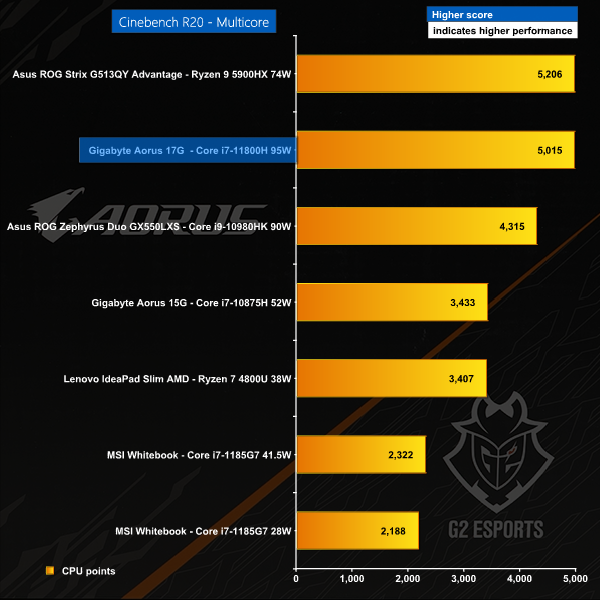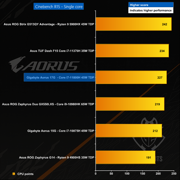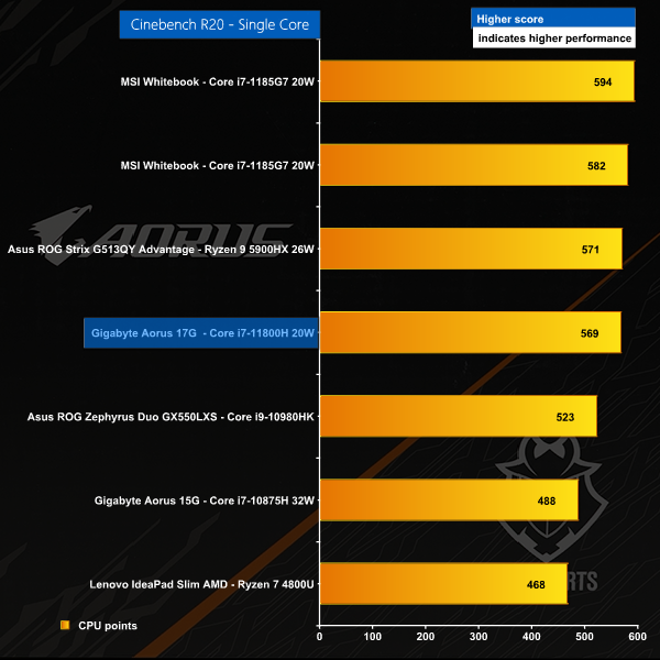 In the single core test the Aorus 17G again does well however the Intel CPU is beaten by AMD despite running at a slightly higher clock speed.
