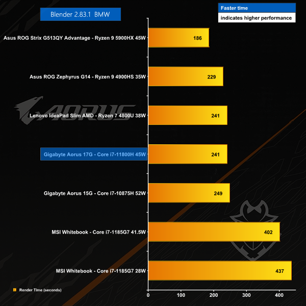 In the rapid Blender BMW test we see the new Core i7-11800H running neck-and-neck with the older Core i7-10875H and soundly beaten by AMD. When it comes to raw CPU performance Intel simply cannot beat AMD.
