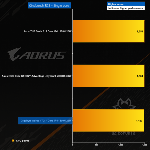 Cinebench R23 is a tough test that demonstrates the problem faced by Gigabyte when it packaged the Core i7-11800H. The quad core Tiger Lake in the Asus TUF Dash F15 drew 50W to run at 4.2GHz so Gigabyte would presumably require 95W once again to achieve the same speed. Unfortunately Cinebench R23 runs for an extended period so the laptop instead feeds 70W to the CPU and as a result the clock speed drops to 3.7GHz